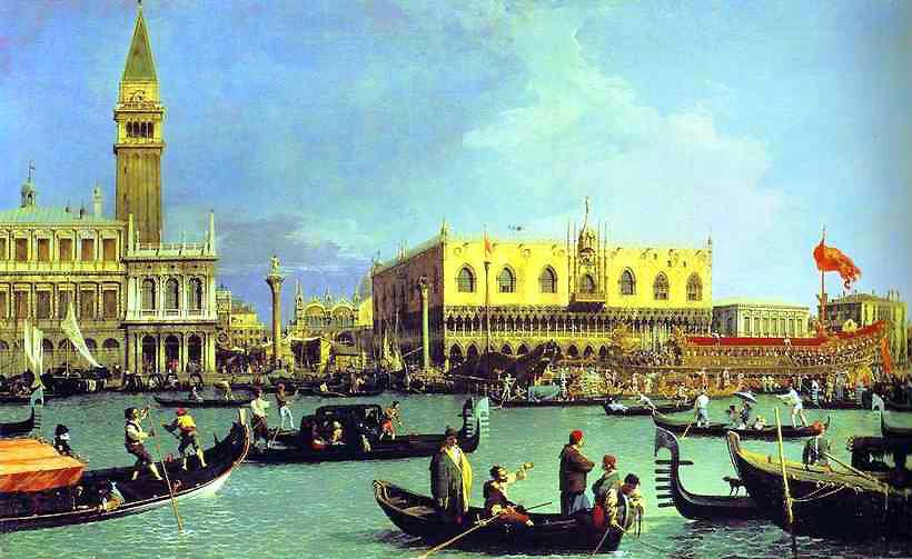 Canaletto – Nunta Veneției cu marea. Plecarea Bucentaurului (cca. 1726) Ulei pe pânză, Gen: vedută ceremonială Temă: fastul politic și maritim al Republicii Veneția