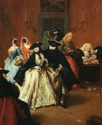 Pietro Longhi este cronicarul vieții cotidiene venețiene. Dacă Canaletto reprezintă orașul oficial și monumental, Longhi surprinde viața privată, divertismentul și comportamentele sociale. Lucrarea prezintă interiorul ridotto-ului, cazinoul public al Veneției, loc de jocuri, întâlniri și carnaval, unde societatea se adună pentru spectacol social și sociabilitate mondenă. Personajele, în mare parte mascate, sunt surprinse în jurul meselor de joc, în conversații sau în simple gesturi de observație, ceea ce creează o atmosferă elegantă, dar ușor ambiguă. Compoziția este frontală și închisă, organizată ca o scenă de teatru, cu grupuri compacte plasate aproape de planul pictural, accentuând intimitatea și caracterul cotidian al momentului. Cromatica pastelată și lumina difuză susțin tonul calm al imaginii, iar detaliile vestimentare evidențiază rafinamentul modei venețiene. Longhi nu dramatizează și nu moralizează, ci observă cu ironie fină comportamentele sociale, transformând ridotto-ul într-un portret colectiv al societății venețiene. Lucrarea devine astfel o cronică vizuală a vieții mondene, dominată de joc, mască, aparență și spectacol social.